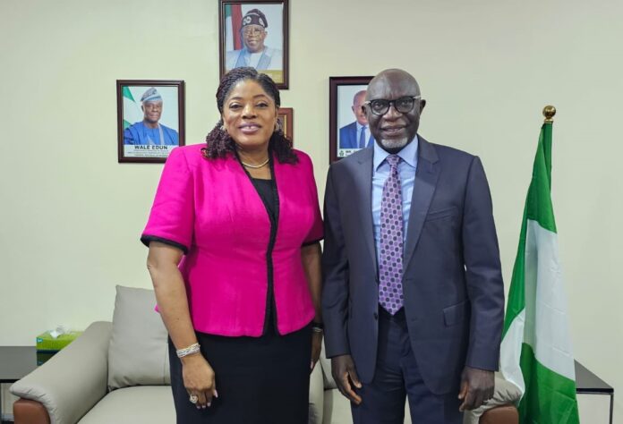 Managing Director/Chief Executive Officer of Asset Management Corporation of Nigeria (AMCON), Mr. Gbenga Alade (right), and the Managing Director/Chief Executive Officer of Fidelity Bank Plc, Dr. Nneka Onyeali-Ikpe (OON) when the Fidelity Bank CEO paid a business visit to the AMCON Boss…in Abuja recently